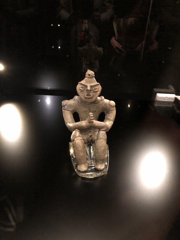The praying clay figurine (a national treasure dated around 500 400 B.C.) excavated from the Kazahari No. 1 site in Hachinohe City is displayed at the Korekawa Jomon Museum. The doguu is called "gasshou doguu" as the clasped hands resemble a Buddhist hand gesture for praying.