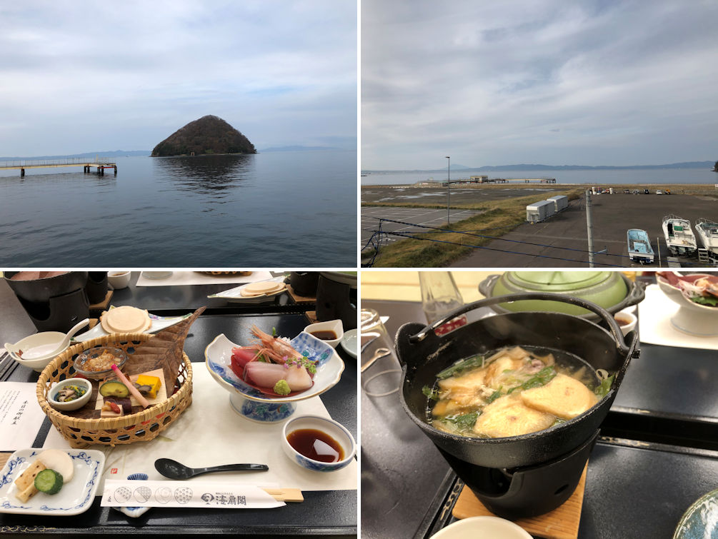 View of Yunoshima and Mutsu Bay (upper left), view of Mutsu Bay with the Asamushi Shore Fishing Park at the seafront, where you can try fishing (upper right), the appetizer (lower left) and local chicken Senbei Pot (lower right) served at the ryokan.