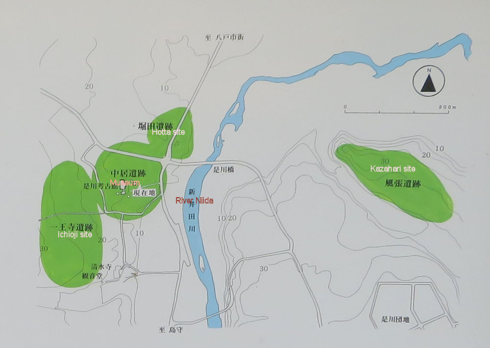 Map showing the four sites composing the Korekawa site and the museum.The four sites lie less than a kilometer apart. The praying doguu was excavated from the Kazahari site on the right.