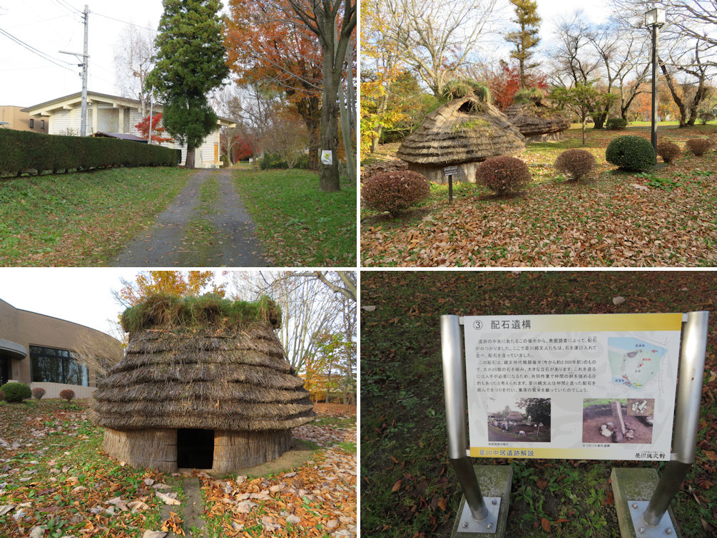 The museum annex was not that far away from the museum (upper left). Some reconstructed Jomon dwellings sat quietly in the woods (upper right). A closer view of a dwelling (lower left). The explanation of the stone circle was only provided in Japanese (lower right).