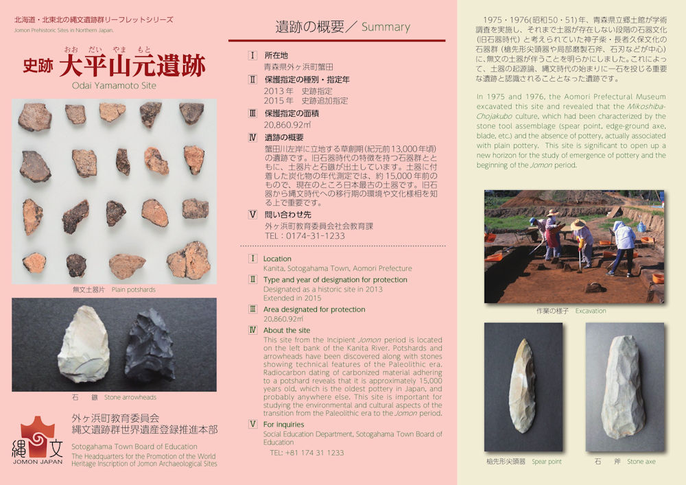 The pamphlet of Odai Yamamoto site. As told by the pamphlet, "This site is significant to open up a new horizon for the study of emergence of pottery and the beginning of the Jomon period."