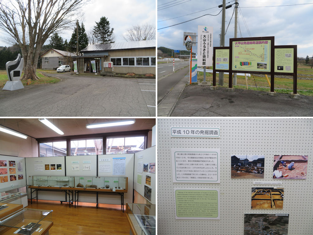 We were looking for signs to the site, when we noticed a small history museum by the road. This was the Oyama Local History Museum converted from a former elementary school discontinued in 1999. We parked in the car park and entered the museum and was welcomed by the curatress. There was no admission fee. She guided us to the exhibition room displaying some of the artefacts excavated from the Odai Yamomoto archaeological sites. It was a small room which doesn’t take long to browse. Although I understand that the arrowheads belong to the oldest type Mikoshiba Style (the name is derived from the Mikoshiba site in southern Nagano Prefecture), it is very difficult for an amateur to distinguish the style from other later sites. The stone tools are made from local shale, one of the reasons for an early settlement in this area. Fragments of pottery were also on display. So few fragments have been found that it was not possible to recreate the original features. The pottery did not have any cord pattern (Jomon), unlike typical Jomon pottery from around 3000 B.C. There were some description in English, obviously in preparation of the possible designation of the site as a group of northern Jomon sites as a UNESCO World Heritage. Oddly the English description did not fully match the Japanese description.
