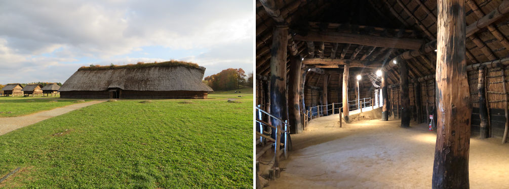The large reconstructed 32 meters long building (left) and its interior (right).