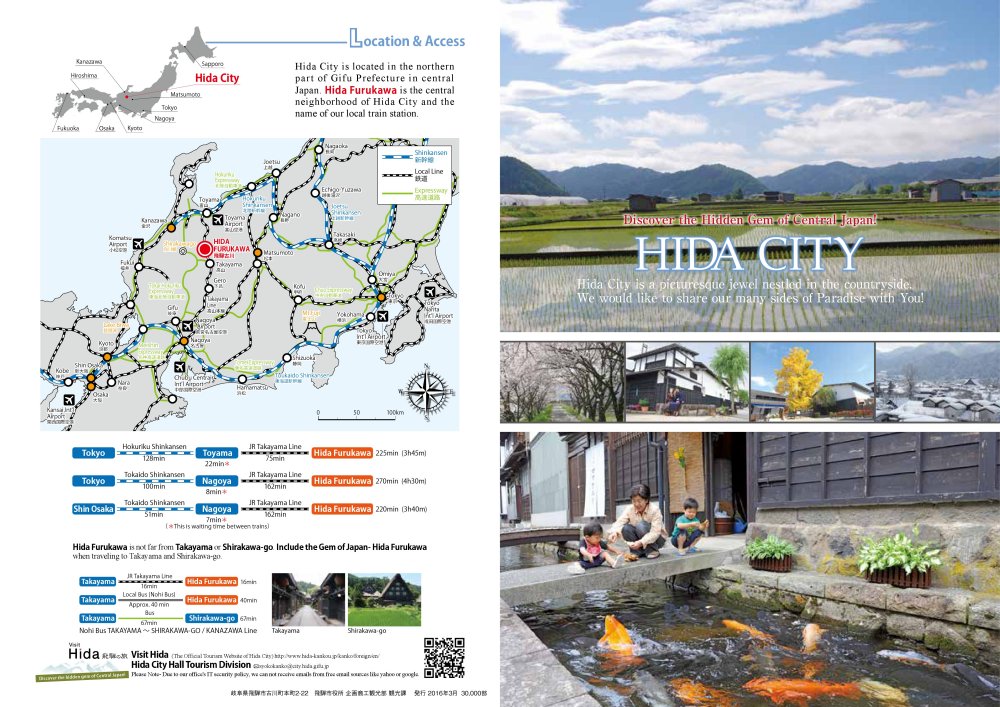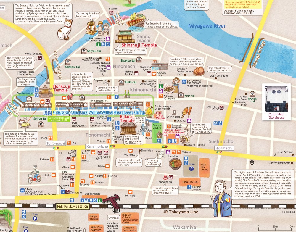A map of the township of Hida Furukawa extracted from the brochure downloadable from Hida City's website. Although the map is small, it'll give you an idea on how I traveled. I started from the free car park on the lower right, followed the white-walled storehouse street to visit the three temples in the town. The last place I visited was the Ketawakamiya Shinto Shrine about 1km south of Hida Furukawa Station on the lower left. As can be seen from the map scale on the bottom right, you will be able to visit most of the places in half a day.