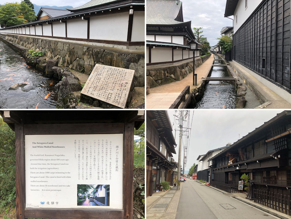 The Setogawa Canal and its carp (upper left), view of the white-walled stores and buildings along the canal towards Enkouji Temple (upper right), explanation provided by Hida City (lower left) and a view of the main street of the merchant area directly on the opposite side of the white-walled stores (lower right).