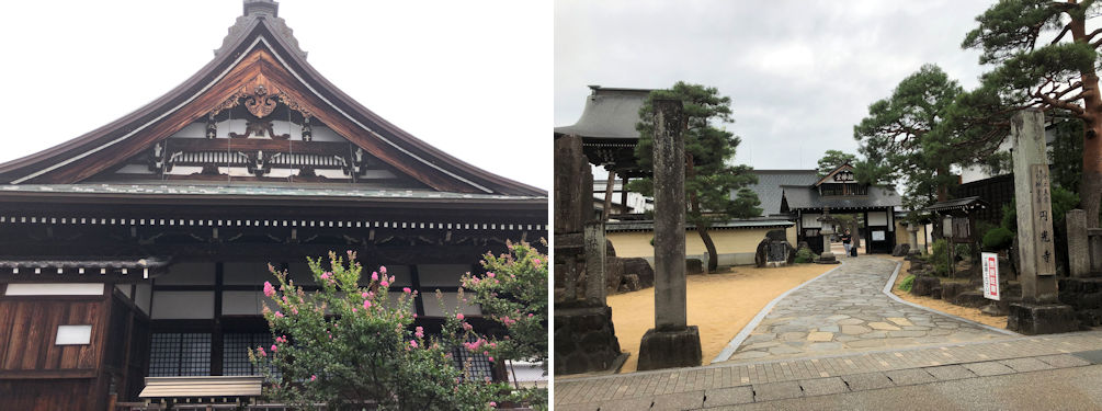 View of the main temple from the canal side (left). The turtle is under the top box eave. Entrance gate of Enkouji Temple. The bell tower, and the temple grounds are beyond the second gate (right).