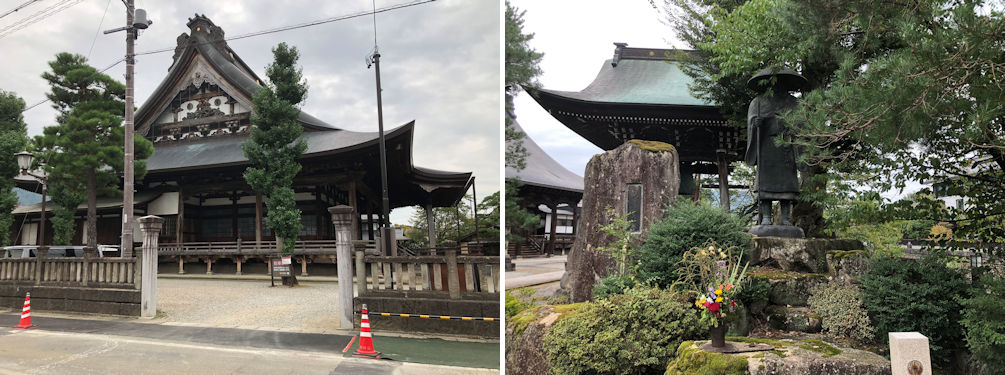 The main temple building (left) and a statue of Shinran, the founder of the Joudo-shinshuu Buddhist sect who people pay respect to in early January (right).