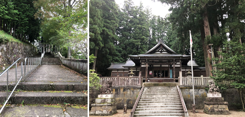 The steps leading to the main shrine area, which briefly featured in the anime movie “Your Name”(left). The main shrine building and the area in front is of a typical style seen in many shrines in the mountain areas (right).