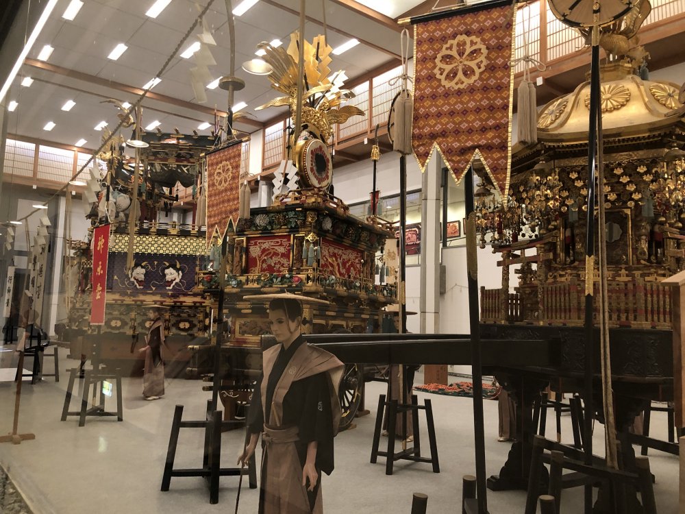 Display of festival floats at the Takayama Festival Floats Exhibition Hall. Takayama is known for its two festivals held in April and October when the Deities of Hie Shinto Shrine and the Sakurayama Hachiman Shrine are taken out of the shrines on the Kaguratai (the festival float carrying the Deity) followed by 11 yatais (festival floats) in spring and ten in autumn. Of the 23 festival floats which are usually stored in storehouses located across the township, four are displayed at the Exhibit Hall on a rotating basis.