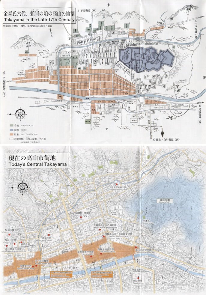 Map of central Takayama in the late 17th century (upper map) and as of today (lower map). The upper map shows the castle in gray on the right, with the merchant district in brown, and the samurai residence uncolored, all basically within the two rivers. This was the original grid-shaped layout of the castle township of Takayama. If you compare this with the lower map, you recognize the merchant district in brown , while the samurai residence and the castle were dismantled in the late 17th century. This map was extracted from a brochure issued by Takayama City "Higashiyama Walking Course". Unfortunately I was not able to find any links for downloading the brochure.