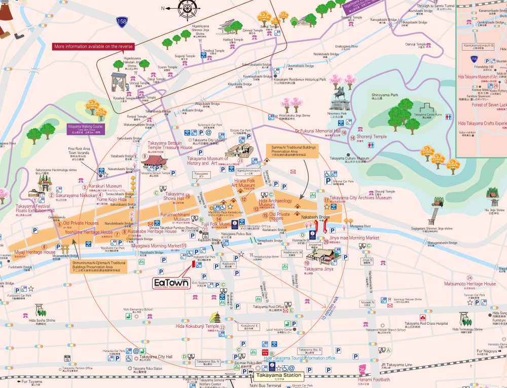 A map of the central Takayama extracted from a map obtained from Takayama City's website to give you a better idea of the route my guides took. We started from JR Takayama Station at the middle bottom, traveled north east to Hida Kokubunji Temple in red marked 22, went further east to cross Miyagawa River. We then went north along the Miyagawa River to the Shimonomachi-Ojinmachi Traditional Buildings Preservation Area (the brown area on the very left), further east to Sakurayama Hachiman Shrine, and then east south along Enakogawa River to visit the Higashiyama Temple area. We finally went downhill back to the city center toward Takayama Jinya marked 17 on the right edge of the brown historic merchant district.