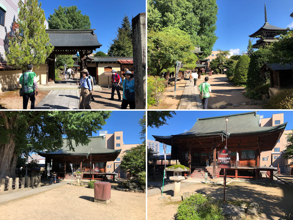 The entrance gate to the temple (upper left). As you enter the gate into the temple grounds, you get a sight of the three-story pagoda (upper right). The main temple building with the 1250 years old ginko tree on its right (lower left) and a closer look at the main temple building built in the 15th century by the latest, and designated as an important national cultural property.