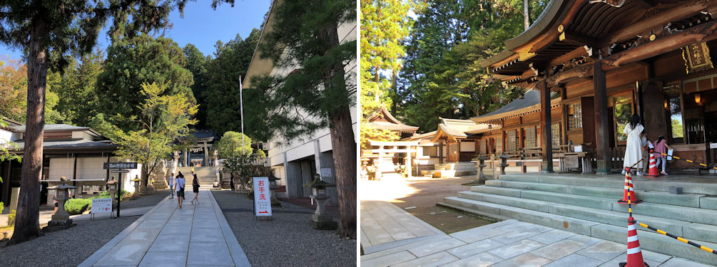 The approach to Sakurayama Hachimanguu Shrine (left), and the main shrine building (honden) (right). The warrior God Hachiman is worshipped at Hachimanguus. Historically the first Hachimanguu was founded in the early 8th century in Usa, Ooita Prefecture. God Hachiman was believed to be the incarnation of the 15th mythical Emperor Oujin. Hence the Deity worshipped at this shrine is Emperor Oujin.