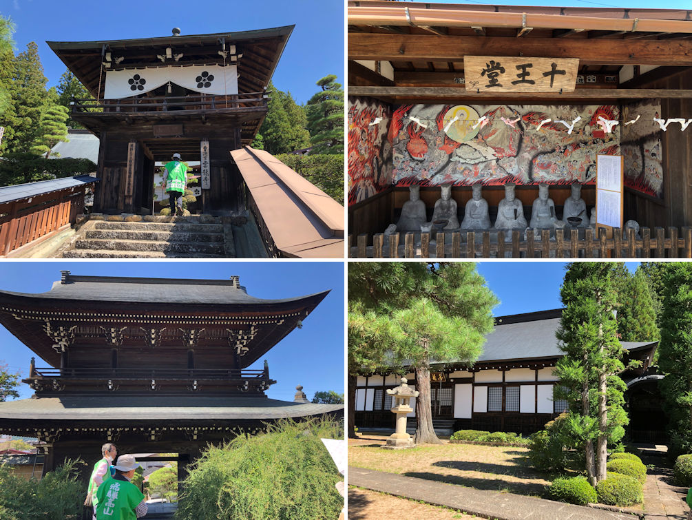 The bell tower of Unryuji Temple relocated from Takayama Castle upon its dismantlement (upper left), the Juuoudou (shrine of the ten Gods of Hell) with a painting of hell in the back. The shrine was for people to repent and pray for merciful judgement by the Gods after they end their lives on earth (upper right), the grand Sanmon Gate (lower left) both of Daioji Temple, and the main temple building of Sogenji Temple housing the grave of Nagachika Kanamori (lower right).
