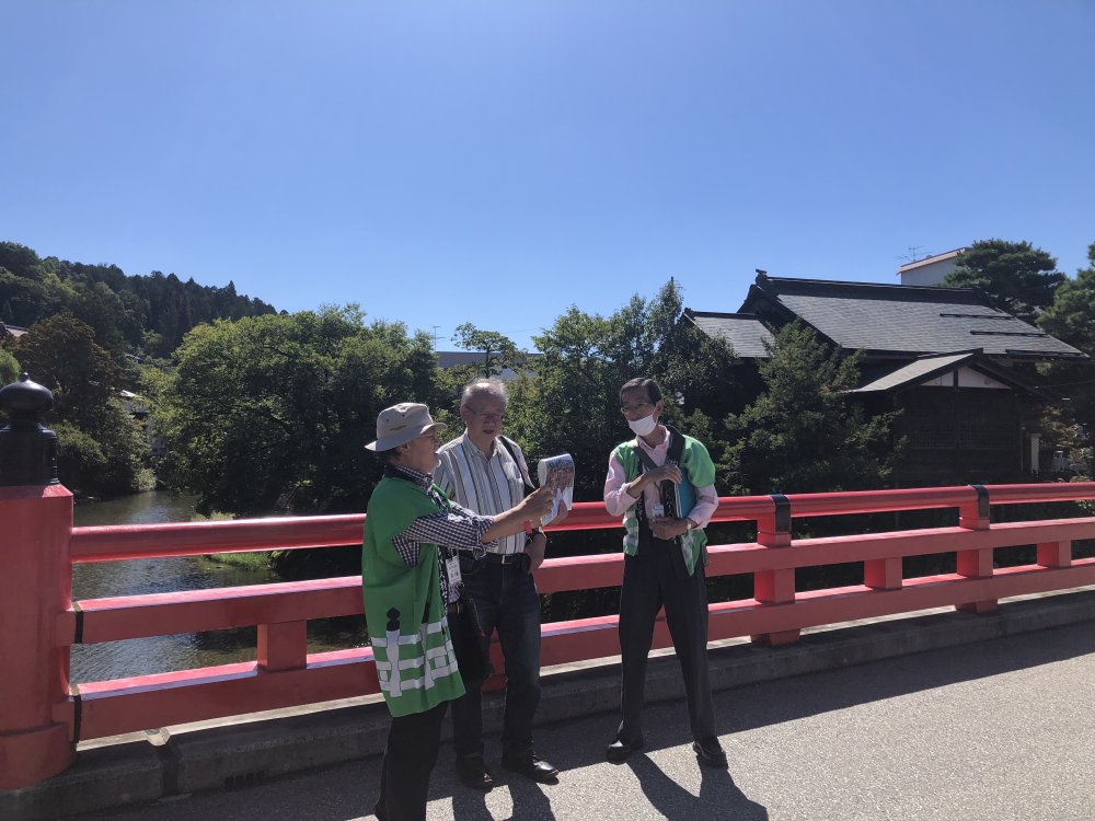 On Nakabashi over Miyagawa River, just before arriving at Takayama Jinya, with the expert guides Mr. Sawa (left) and Mr. Kose (right).