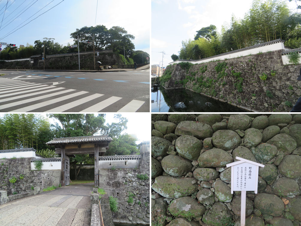 Upper row: The castle area (left) and the castle walls (right). Lower row: The castle entrance gate (left) .The sign tells that the casle stone walls were built "nozurazumi", a method of building castle stone walls by piling up natural stones or split stones with minimal processing (right).