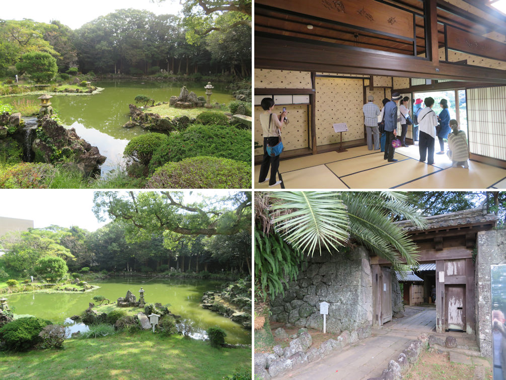 (Upper left) The garden is a typical promenade garden, where you enjoy walking around the pond in the middle (usually taking the form of the kanji character for "心 (heart). Upper right) Interior of the residence. It has quite a few large tatami rooms. (Lower left) View of the garden from the residence, providing the best view. (Lower right) Entrance to the residence.