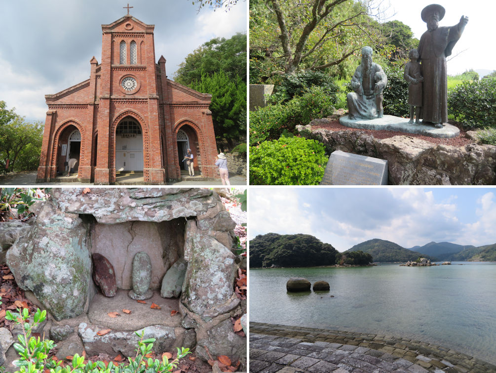 The brick-built Dozaki Church, completed in May 1908 (upper left) The statues of Fathers Frénot and Marmand in the church gardens (upper right) The shrine housing two stone statues resembling Maria Kannon also in the church gardens (lower right).