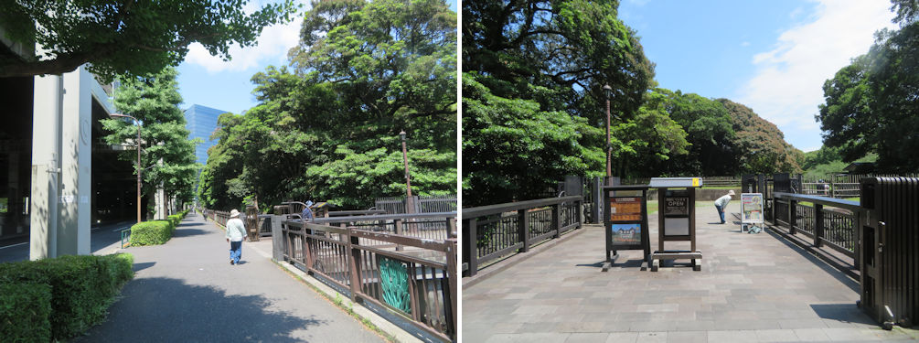 Coming from Toei Subway Oedo Line Shiodome, it was about a 10 minutes' walk to the The Naka-no-gomon Gate. Looking north as you approach the Naka-no-gomon Gate on the right (left), and view of the Naka-no-gomon entrance (right). The admission fee is 300 yen.