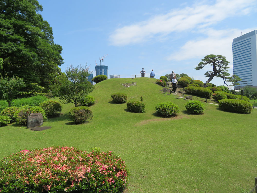 From there, we headed back in the direction of the Naka-no-gomon Gate, where we had first entered the garden. We followed the same route we had taken earlier on our own and emerged once again in front of the tidal pond. Along the way, the guide gave various explanations about the plant life, but I will omit those details here. The guide then led our group to the southwestern edge of the garden (which appears in the upper right corner of the map above). The first site introduced in this area was the well-preserved remains of a horseback riding ground (baba-ato).