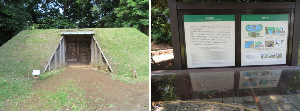 A konozoki (literally small peephole), which is a structure for people to hide and scatter food to lure the birds toward the trench built behind. Behind the konozoki is a pond to attract the fowl (left). There is a detailed description beside the konozoki that tells how they caught the fowl (right).
