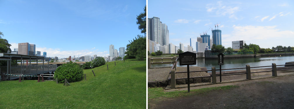 (right) Site of the Shogun Oagariba. The river behind is Sumida River. Before the land reclamation in modern times, this would have been the seafront of Tokyo Bay. (left) The Water Bus pier. You can barely make out Tokyo Skytree in the background. The water bus cruises Sumida River downstream from that area (Asakusa) to reach this pier.