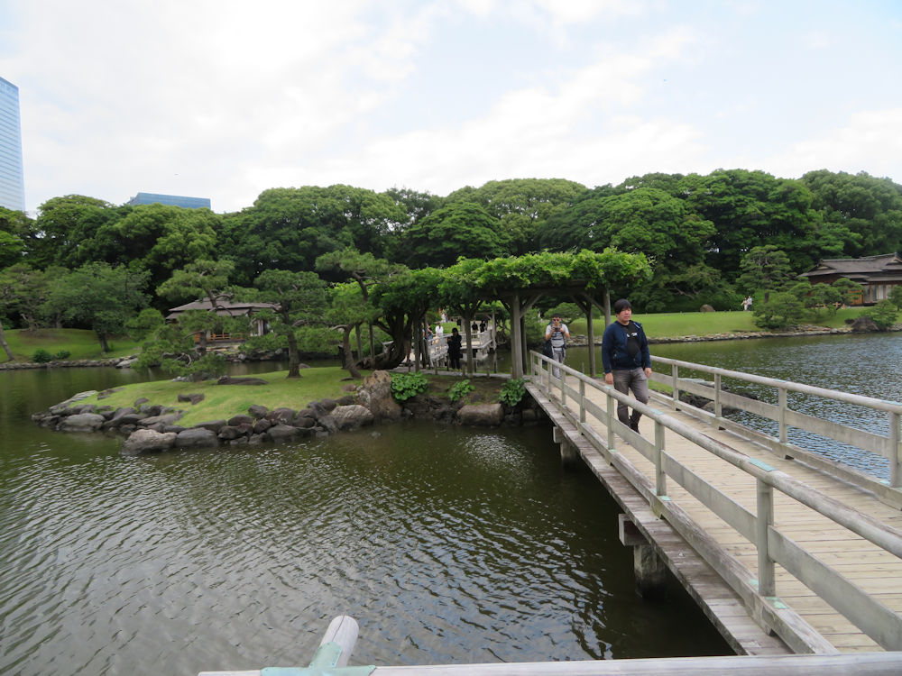 Turning right at the end of the path, I soon found myself in a dense woodland area. Emerging from the woods, I was suddenly greeted by a large pond spanned by a prominent wooden bridge (O-tsutai-bashi) at its center. This is the Shioiri-no-ike, a tidal pond fed with seawater. One of the garden’s distinctive features is how the appearance of the pond changes with the ebb and flow of the tide. In fact, Hama-rikyu is said to be the only garden in Tokyo that still draws in seawater today.