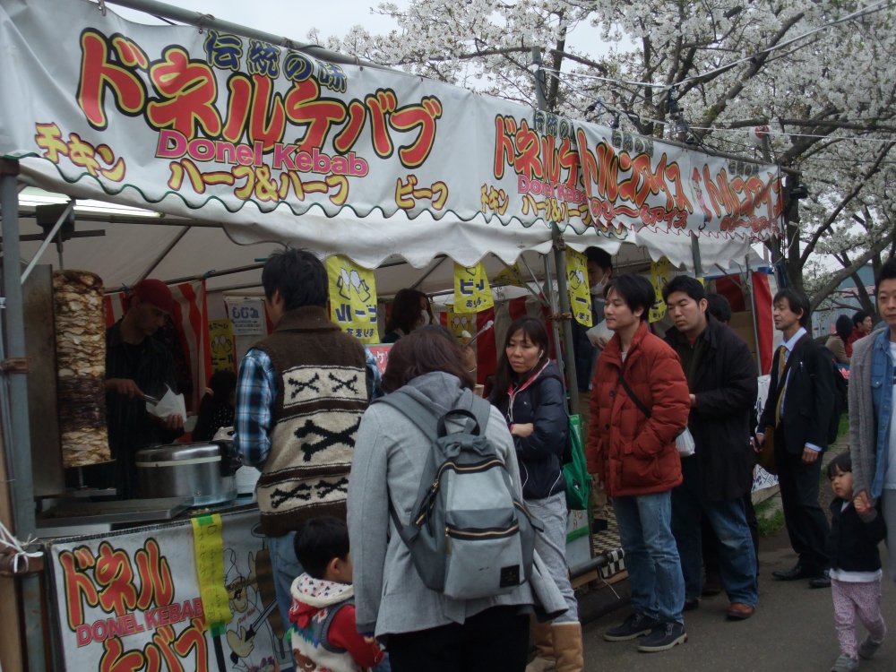 HANAMI goers queing in front of the Kebab shops at Ebigawa