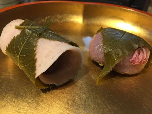 SAKURA-MOCHI. Kantou style Choumeiji (left) and Kansai style Doumyouji (right) Note the cherry leaves.