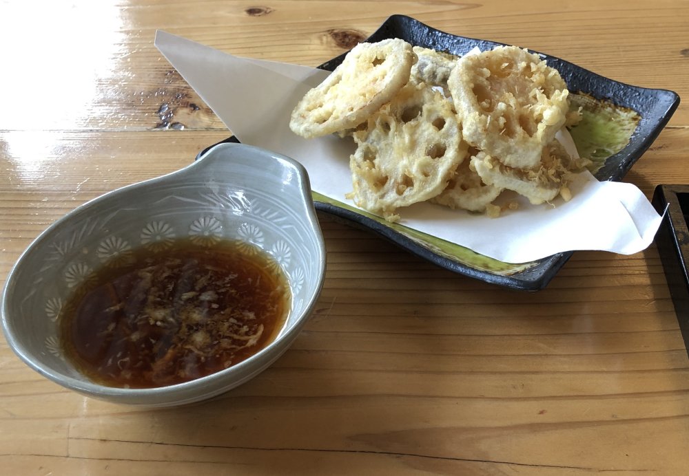 I chose a cold tenzaru-soba (soba noodles and tempura to enjoy in a dip sauce) together with a lotus root tempura from their seasonal menu. The hand-kneaded soba was relatively short with a pleasant aroma and met my taste. I found the lotus root (coming from Lake Kasumigaurs), which was fresh and firm, was also quite good. The prices were very reasonable with the tenzaru priced at 1,300 yen.