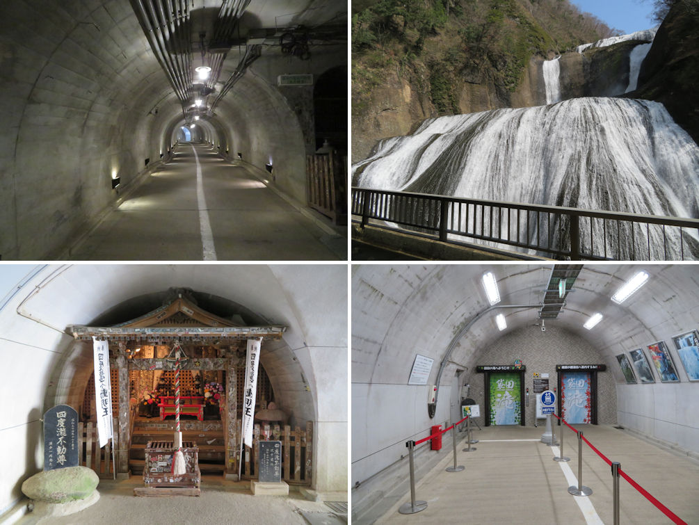 The tunnel leading to the elevator to the top observation area (upper left), balcony area allowing a view of the falls from close proximity.(upper right), Yodotaki (four drop waterfall) Fudoson, an altar dedicated to a Buddhist deity (Fudoson) closely linked to Buddhism/Shintoism spiritual training in mountains and waterfalls to dispell earthly desires (lower left) and the elevator leading to the top (lower right).