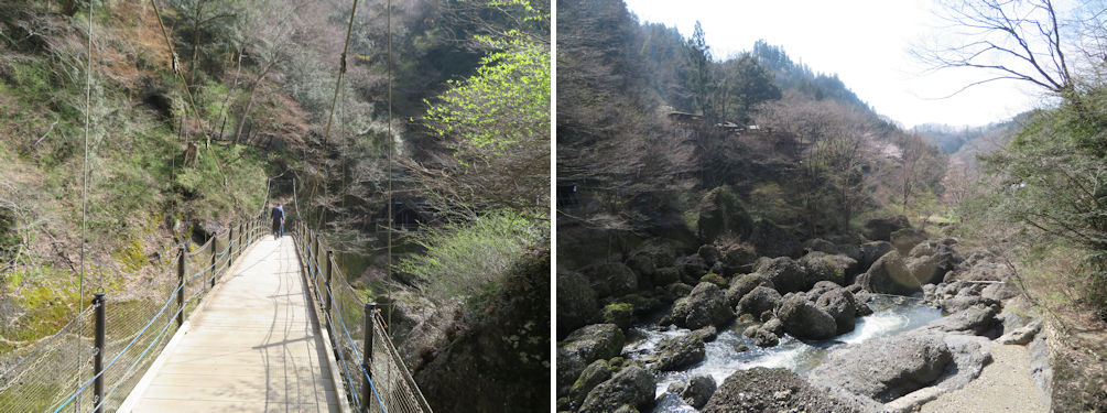 The suspension bridge to the northern side of the river (left), Taki River flowing west to finally join Kuji River whivh flows east to the coast (right).