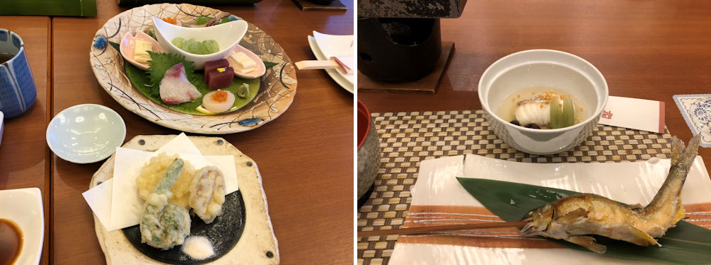 Dinner was served in the room and with many local delicacies. The sashimi and tempura including sashimi of konnyaku (in a bowl) among other fresh seafood (left) and grilled rainbow trout (right).