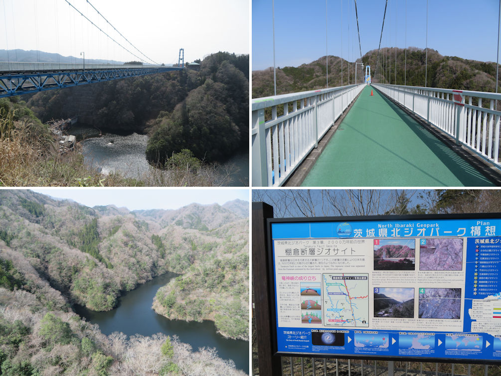 The suspension bridge seen from the opposite side. It is 375 meters long (upper left). The bridge is quite sturdy so that visitors nervous of swaying can enjoy a walk across (upper right). View of the valley from the bridge (lower left) and an interesting explanation (with English) of the Tanagura Fault was provided at the opposite side (lower right).