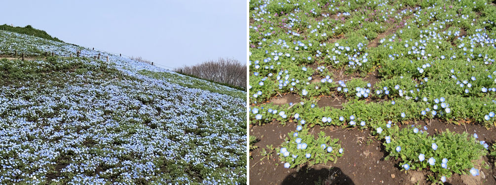 We drove southeast towards the seaside to our next destination, Hitachi Seaside Park, a national park in Hitachinaka City. As the English website of the park says, the park “offers beautiful flowers in its well-kept, large gardens throughout the year”. It is particularly known for its beautiful beds of nemophila (baby blue eyes). The nemophila was at 30% bloom when we visited the park in early April. It’s a huge park of 2 million square meters (500 acres) with many car parks. We parked in a car park on the east side close to the sea. We paid the parking fee of 500 yen and admission fee to the park of 210 yen for those above 65 (normal fee 450 yen). Following the map provided, it took us ten minutes to arrive at the nemophila beds. Visitors were not that many, and we enjoyed a pleasant walk along the beds up and down the hill slopes. There were food stalls and flower shops in the square at the bottom of the nemophila beds.