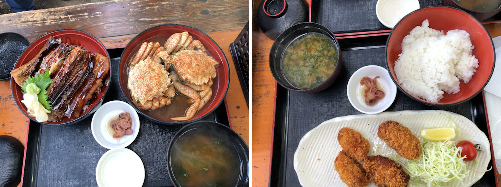 The broiled anago with crab miso soup (left) and the fried local oysters (right).