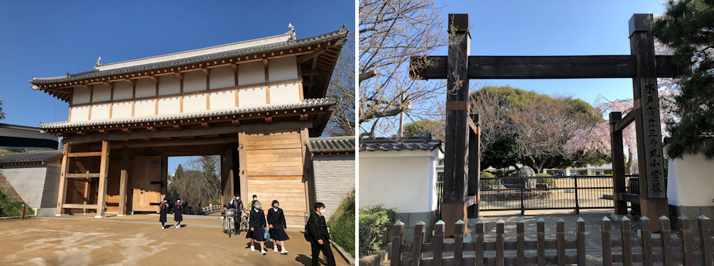 The resurrected Ootemon (left). A large part of the castle ground now house schools. Sannomaru Elementary School using an old gate for a side entrance (right).
