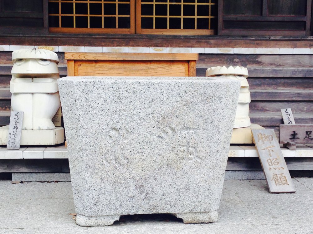 The offering box and entrance of the temple in front of Kappa ridge. Two kappas ask you to remove your shoes before entering.