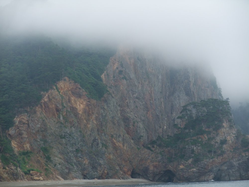 The following morning we went for a boat cruise to Kitayamazaki, from a small fishing port of Tsukue (which means desk in Japanese) a couple of kilometers north of Raga-so. We were concerned whether the cruise would start as on the day before we had noticed a dense mist all over the sea. Luckily the mist had disappeared and the morning rain was letting up. We took off on a small shipping boat (sappa boat) where I and my wife were the only customers. Our captain was very hospitable and a good guide. His name was Tsukue, and he told us that there were many in the area with a Tsukue surname, which is a very odd and rare surname. He told us that the dense mist we saw was a phenomenon called Yamase.