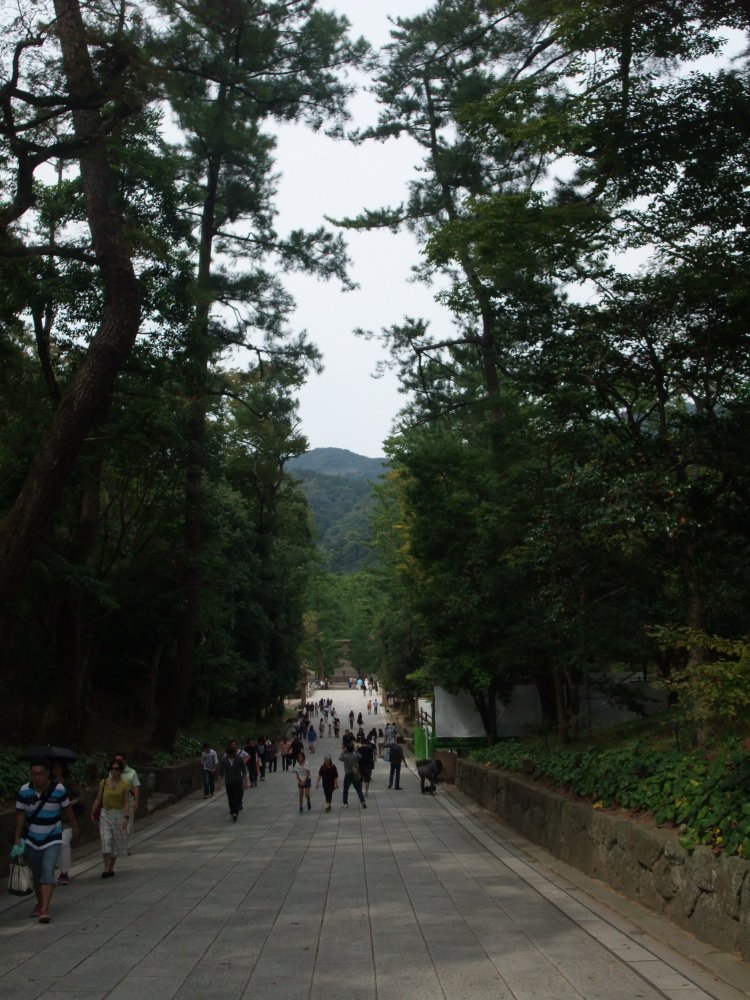 People walking along the main entrance road to Izumo Taisha. Note the woods