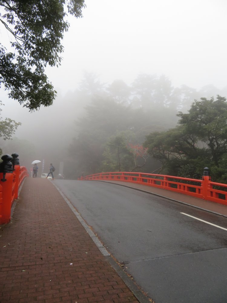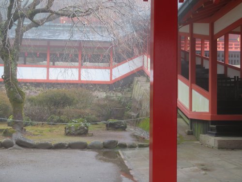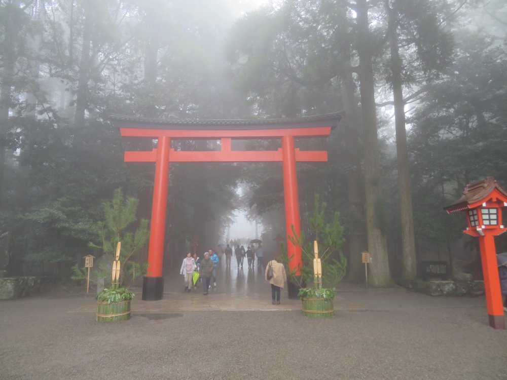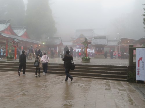 It was raining that day and the shrine was engulfed in a dense fog when we arrived in early January which intensified the sacred and mystical atmosphere of the shrine. From the entrance torii gate we crossed the sacred bridge to come to the bottom of steps leading to the shrine buildings level. From the top of the stairs appeared the second torii gate followed by a paved approach with a gradual rise to reach the shrine offices (shamusho) completed in 1930 in a genuinely Japanese building style.