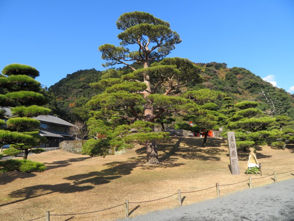 Kagoshima is famous for its shouchuu, distilled alcoholic beverage made usually from sweet potatoes or barley. It is customary for local breweries to dedicate their beverage to Shinto shrines. Usually it would be sake barrels on the side of torii gates. But here in Kirishimajinguu there were no displays of barrels. Instead there was a board with brand labels. There was only one sake brewery that I noticed was on the board. We left Kirishimajinguu and drove west to our next destination the gardens of Sengan-en and the historical building of Shoko Shuuseikan, both a World Cultural Heritage site.