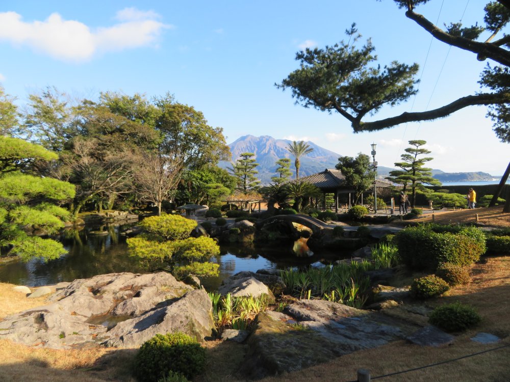 We paid the admission fee of 1,000 yen that allows you to visit both the gardens and Shuuseikan and as we made our way to the residence and main garden area there were gift shops with an extensive range of local products from food to craft. Following the gift shops we came to a recommended photo site with a spectacular view of Mount Sakurajima. The best view of the garden with the borrowed scenery in the back is admired from the best room in the residence. So I went as close as possible to the main residence to command this spectacular view.