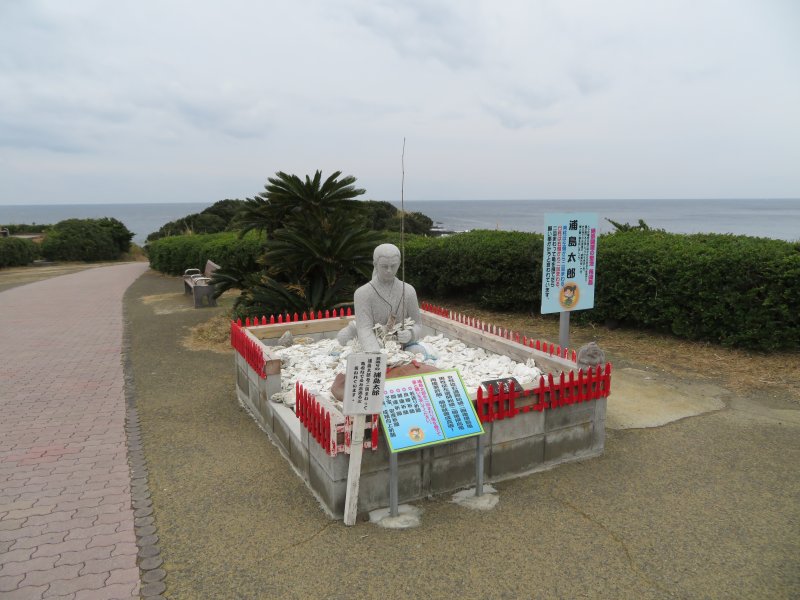 A comical statue of the folk lore character Taro Urashima (left) and Ryuuguu Jinja (right).
