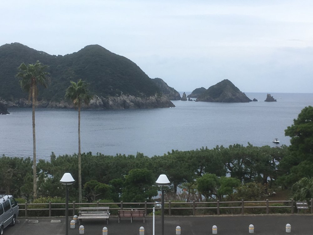 View of the rias type coast from Kishinkan Museum. The two spear like boulders shooting up from the sea is called Soukenseki (two sword boulders).