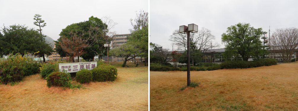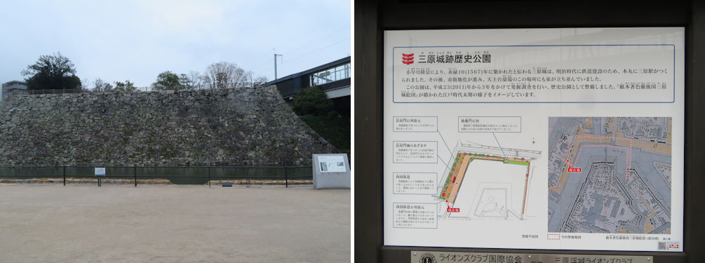 Looking north from Mihara Castle ruins (left) and south. The station platform can be seen in the back (right).