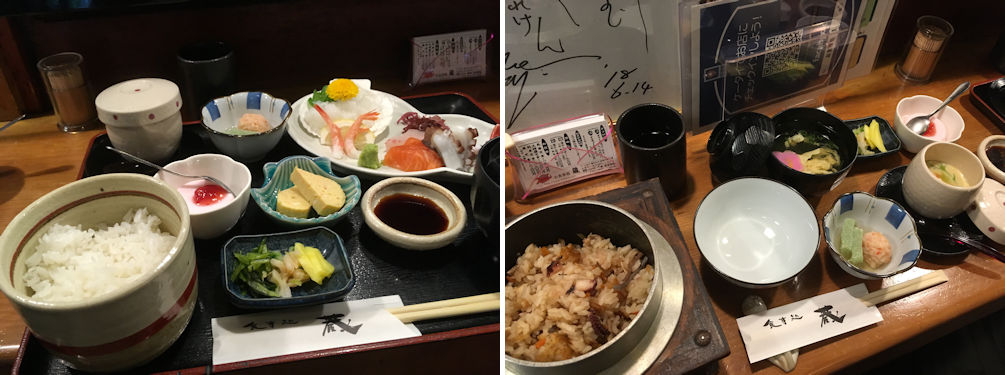 The sashimi lunch course (left) and the takomeshi lunch course (right). Octopus is a popular feature in Mihara City.
