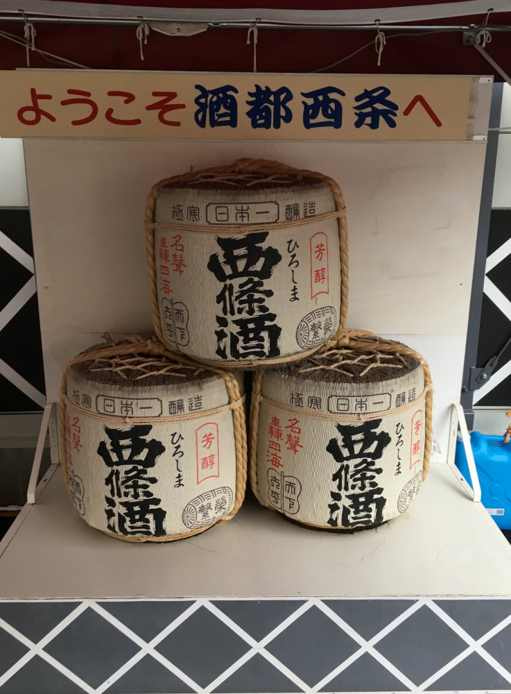 This display was left over from the sake festival. It welcomes us to Saijou, the sake brewing town, with three sake barrels labeled Saijoushu (Saijou sake). I don't know if a pun was intended but Saijoushu can also mean "the very best sake".