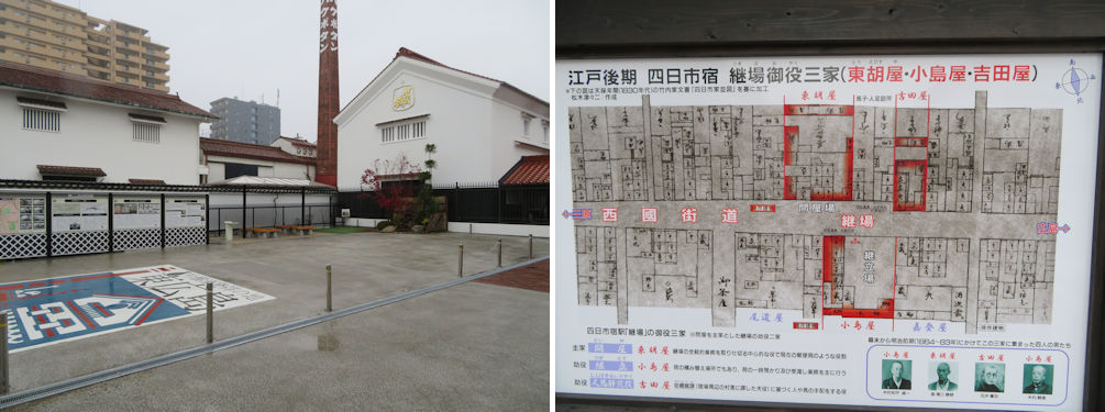The Saijou Honmachi History Square tells us about the history and people that contributed to sake brewing in Saijou (left). The old map shows the rows of lodging and and the three main houses that had functions of a post office, goods handling and procurement of fresh horses in Saijouyokkaichi in the Edo era (right).