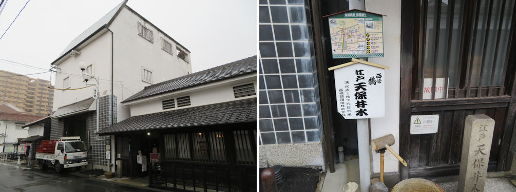 Saijoutsuru established in 1904 continues to brew sake from local rice and quality water from its well (left). The Edo Tenpou well water. Tenpou is a period around 1830. You can enjoy a free drink of this water from twenty two meters underground (right).